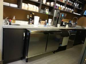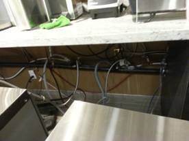 熟悉装饰业的胡女士,一再要求装修时再加上胶合木板作承托,但老板只是在边缘加了个木条了事。胡女士说,石材要加上木板作托是最基本的常识要求,没有胶合板作底托,厨柜台面石板会很容易折断破碎,而且一块胶合板就只数十元。迫不得已,胡女士只好与丈夫一起买回来胶合板,自己当起装修工来,花一番力气动手在石面底加上去,再装上木方支撑,才敢放心使用吧台(图4)。但这样,咖啡店被迫延迟到6月7日才能对外开业,生意当然受到了影响。